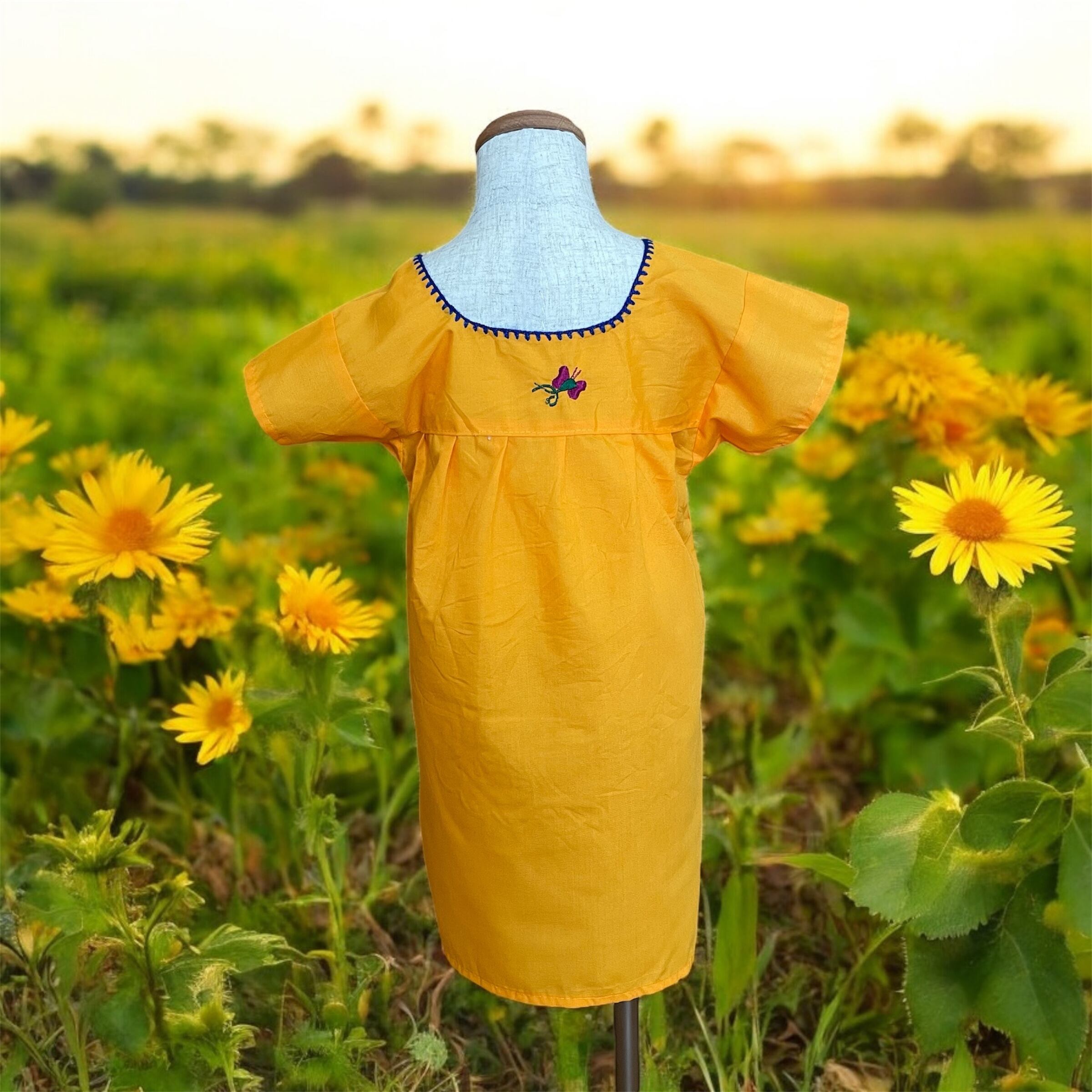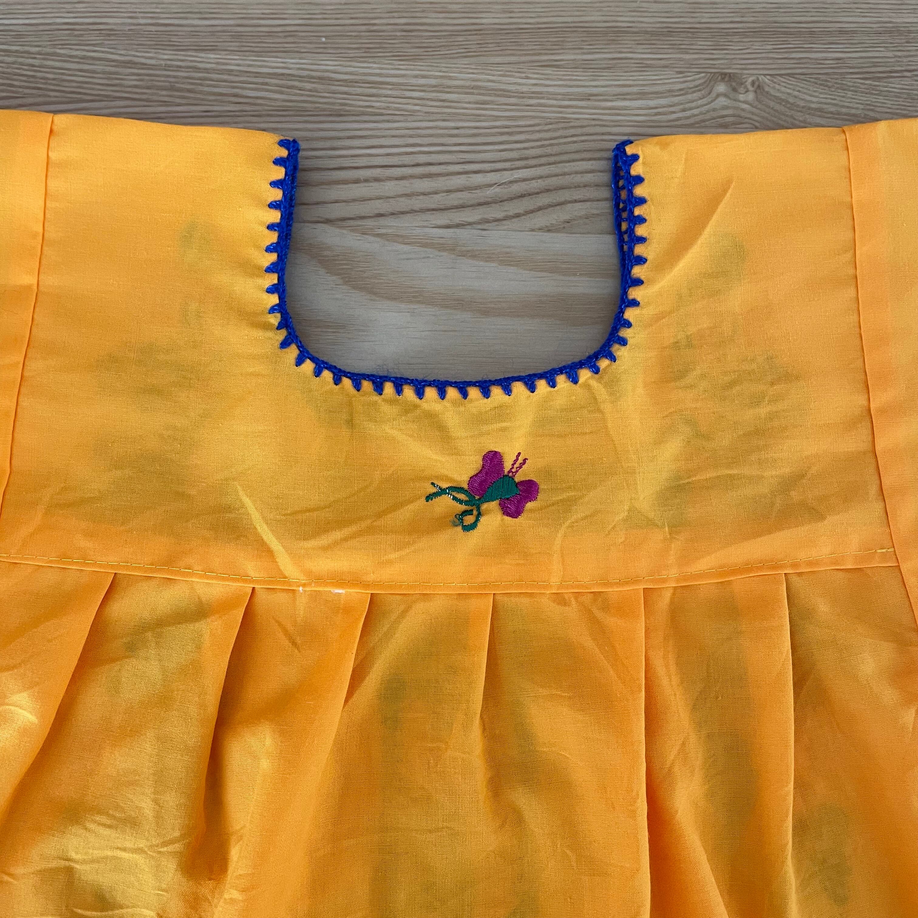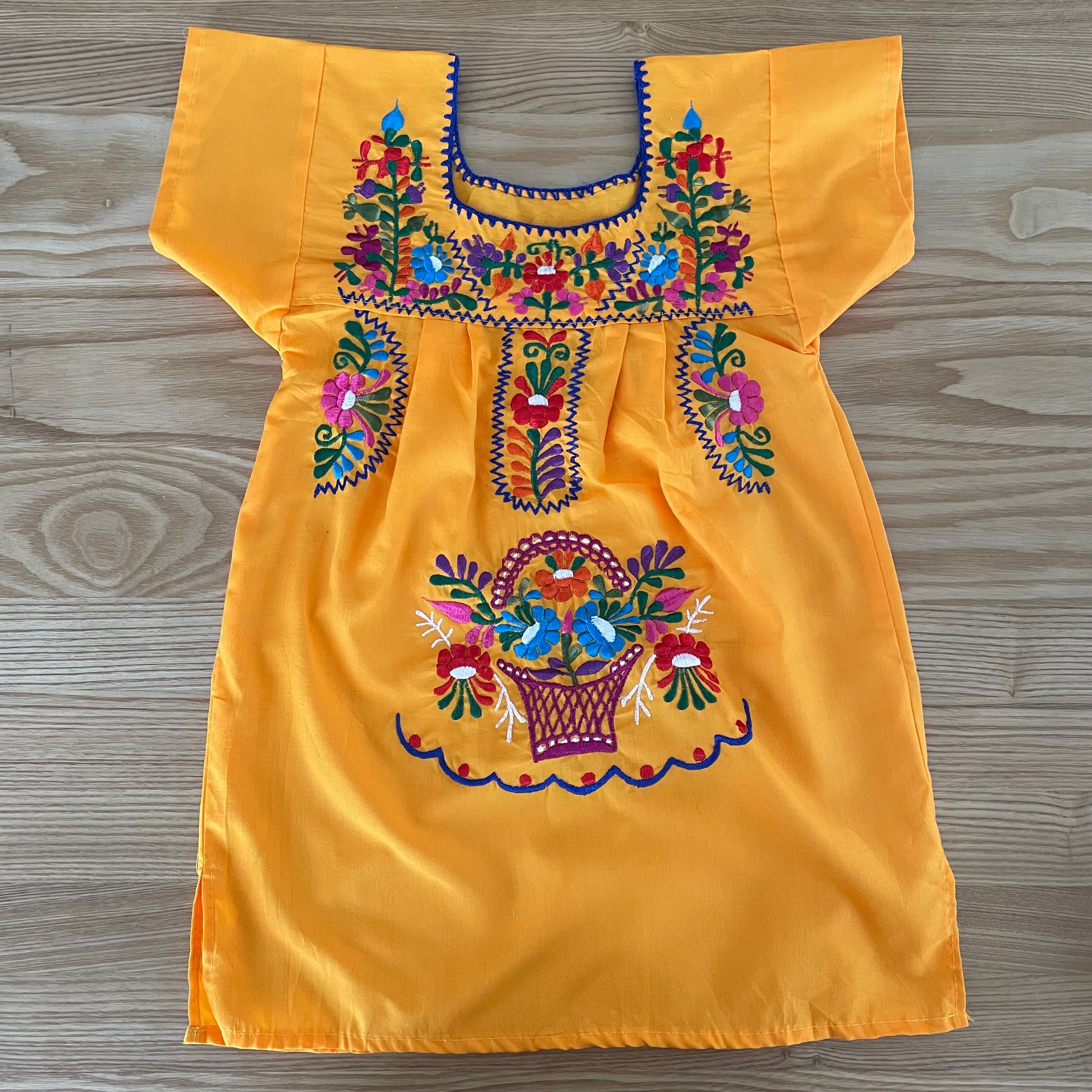 オレンジ×ブルーのステッチの色鮮やかなハンドメイド刺繍が可愛らしい、メキシカンスタイルのキッズドレスです。